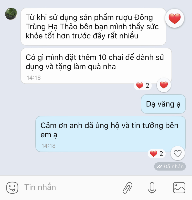 => Hải Thương rất vinh dự khi nhận được sự tin tưởng từ khách hàng khi mua sản phẩm rượu Đông Trùng Hạ Thảo của chúng tôi.